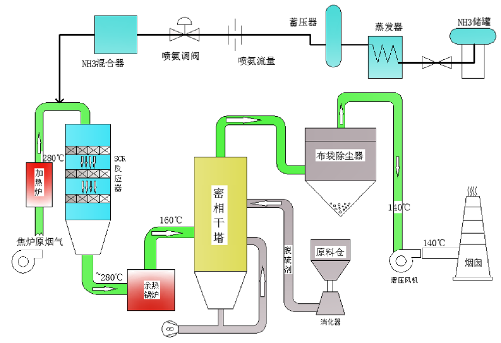 焦?fàn)t煙氣→加熱爐系統(tǒng)→ SCR 脫硝系統(tǒng)→余熱鍋爐系統(tǒng)→半干法脫硫系統(tǒng)→引風(fēng)機(jī)→煙囪