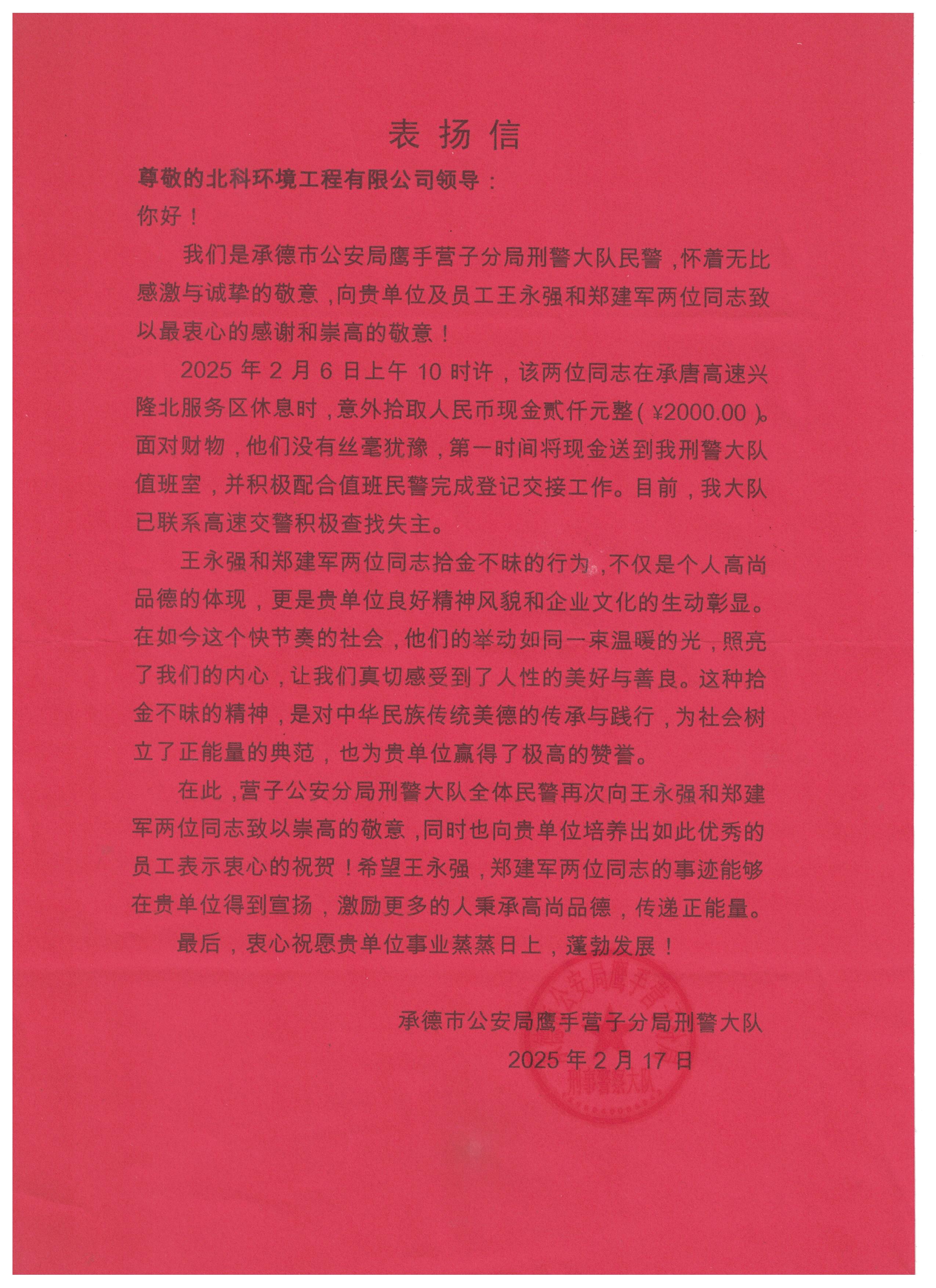 2025年2月6日上午10時許,北科環(huán)境員工王永強、鄭建軍在承唐高速興隆北服務區(qū)休息時,意外發(fā)現(xiàn)了一個裝有2000元現(xiàn)金的紙包。面對這筆“天降橫財”,他們沒有絲毫猶豫,立即驅(qū)車趕往承德市公安局鷹手營子分局刑警大隊,全程配合警方完成了財物的登記與交接。目前,警方正聯(lián)合高速交警全力尋找失主。