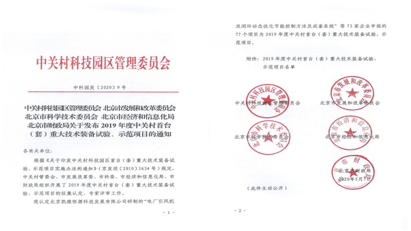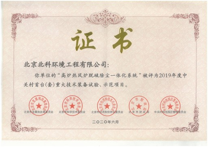 2020年6月,北科環(huán)境喜迎捷報(bào),由公司自主研發(fā)的“高爐熱風(fēng)爐脫硫除塵一體化系統(tǒng)”,被評(píng)為2019年度中關(guān)村首臺(tái)(套)重大技術(shù)裝備試驗(yàn)、示范項(xiàng)目。